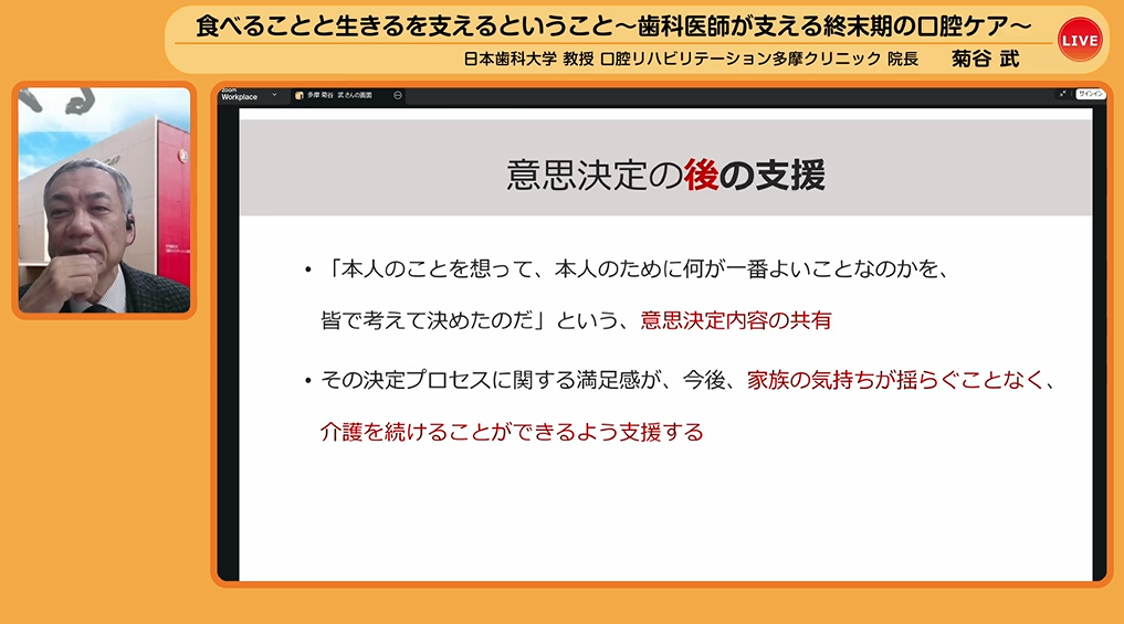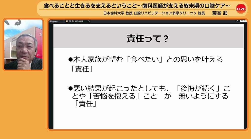 “食べるを支える、食べられないを支える”というメッセージは、終末期ケア専門士としての在り方そのものを示しています。