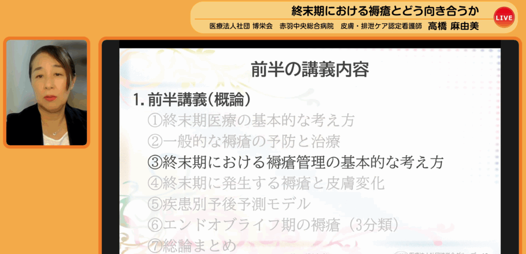 褥瘡に悩んでいてこの講義に参加しました。とても、勉強になりました。ベッドを入れるタイミングや褥瘡が治らない時期の家族への説明も分かりやすかったです。
